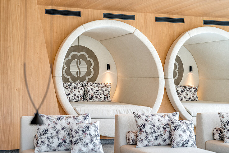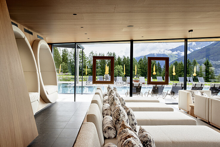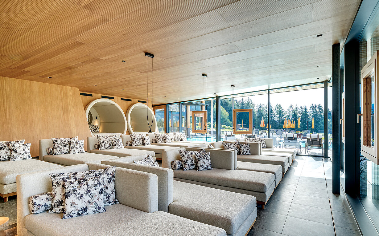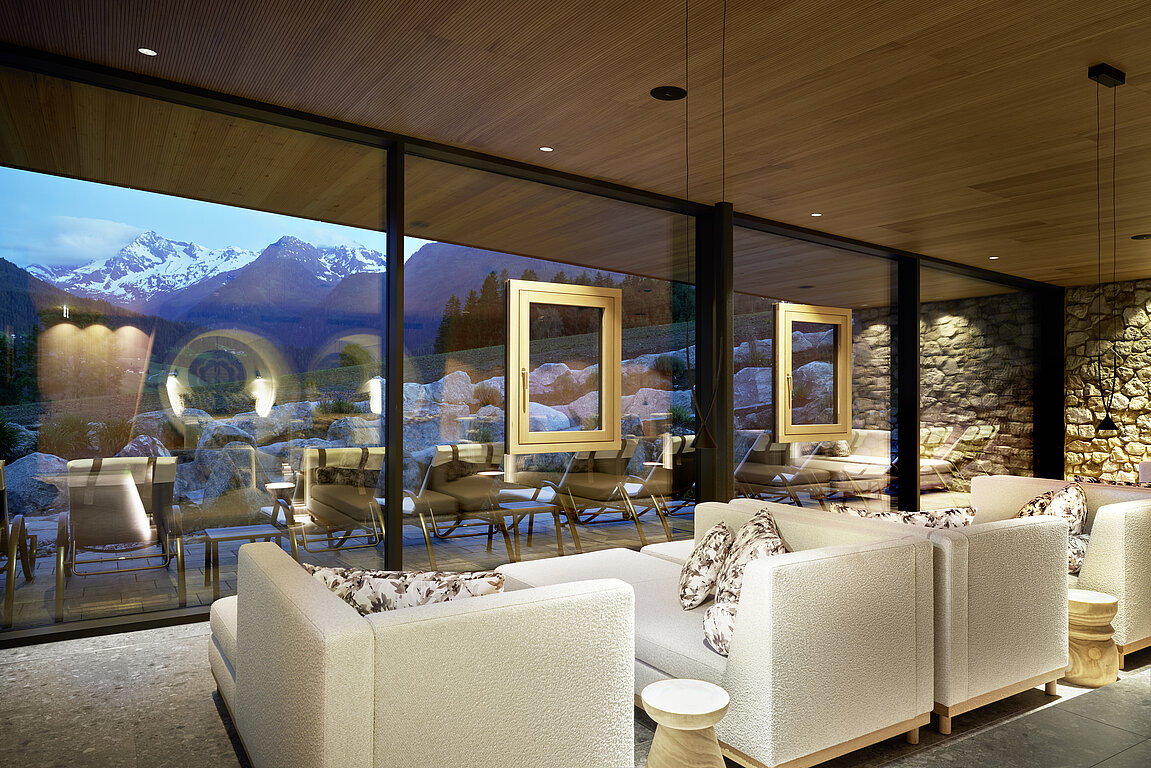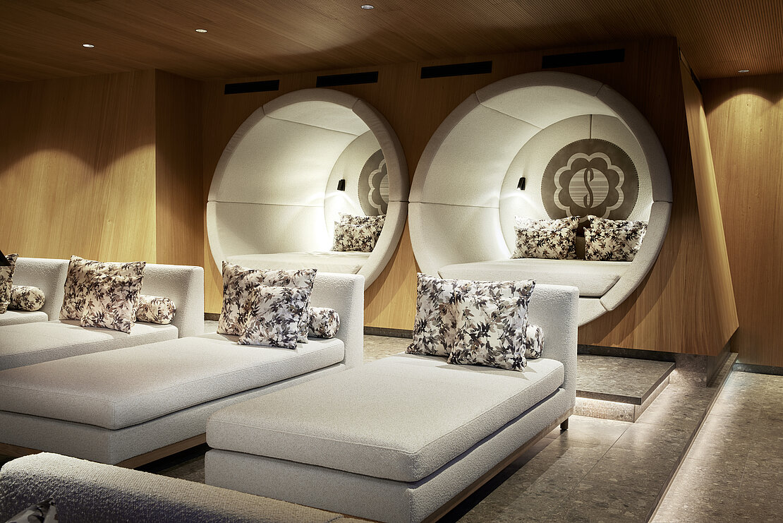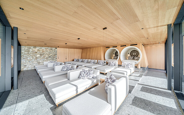 For the new wellness and relaxation area of the Sonnberghof Naturhotel we supplied the upholstery fabrics OLYMP and FREILUFT. These qualities were selected for their natural look, high durability and easy care, and blend seamlessly into the hotel’s sustainable interior concept. The result is a calm and long-lasting lounge area that atmospherically supports the architectural language of wood and stone.